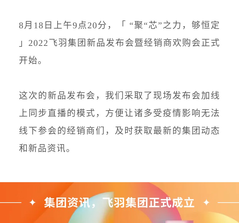 8月18日,以“聚“芯”之力,夠恒定 ”為主題的2022飛羽集團新品發(fā)布會暨經銷商歡購會在寧波奉化圓滿落幕。