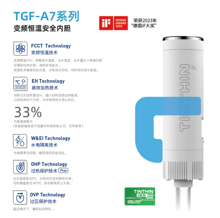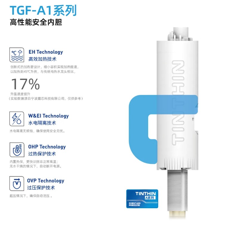 作為一款標準化的加熱模組,霆芯?高性能安全內膽以高效加熱技術為核心,以多項安全技術為保障,成功應用于電熱水龍頭、小廚寶、淋浴器、以及智能加熱類等產品領域,解決中小型即熱式企業(yè)的技術難點。